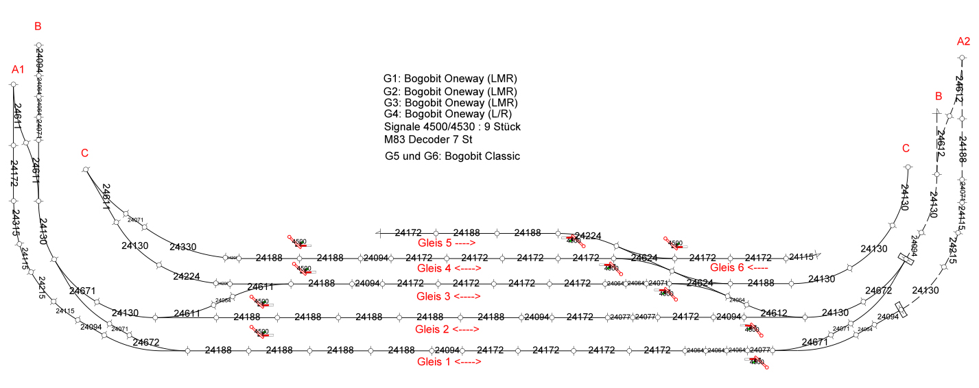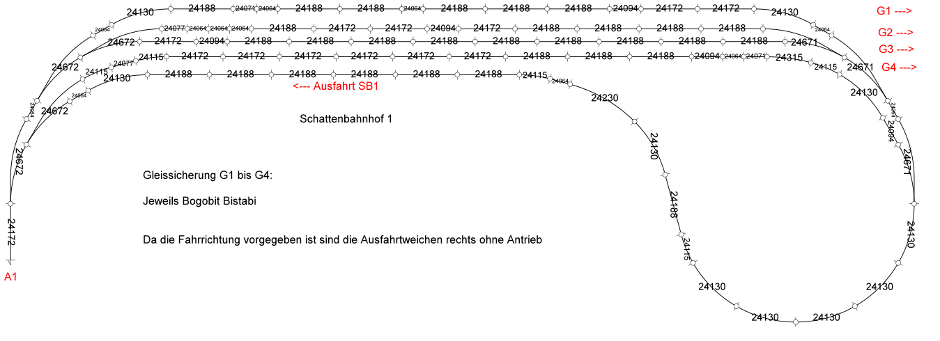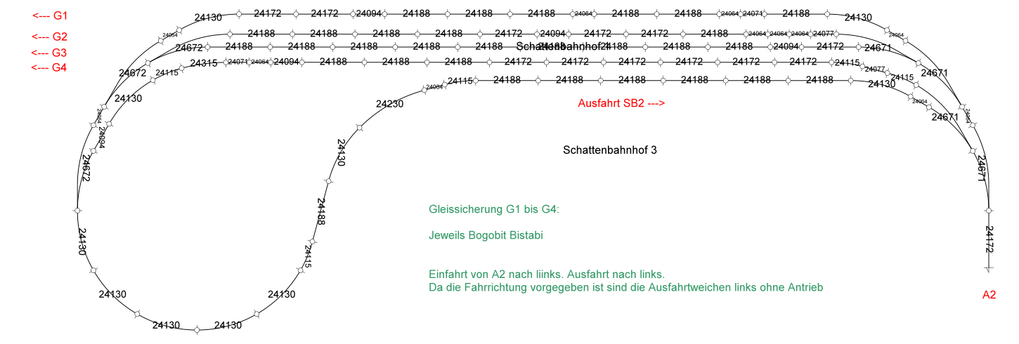 Die Ausfahrten A1 und A2 führen in weitem nicht immer sicht baren Bogen zu den Schattenbahnhöfen 1 und 3. Diese sind nun etwas abgespeckt und haben jeweils nur noch 4 Gleise. SB1 und SB2 sind jeweils am Ende des "Hundeknochens" in einer Kehrschleife aufgebaut. Da hier nun in beiden SB's immer nur eine Fahrtrichtung anliegt wurde hier somit 8 Bogobit Bistabile Bremsmodule eingebaut. Und zu dem sind die Ausfahrweichen nicht elektrifiziert.