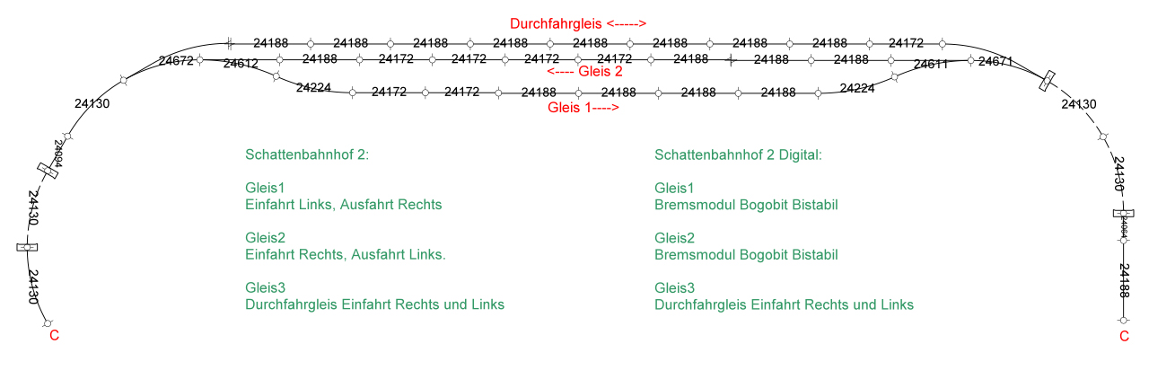 Gleis 1 und 2 des Schattenbahnhof 3 sind richtungsabhängig mit Bogobit Bistabil - Bremsmodule ausgestattet.