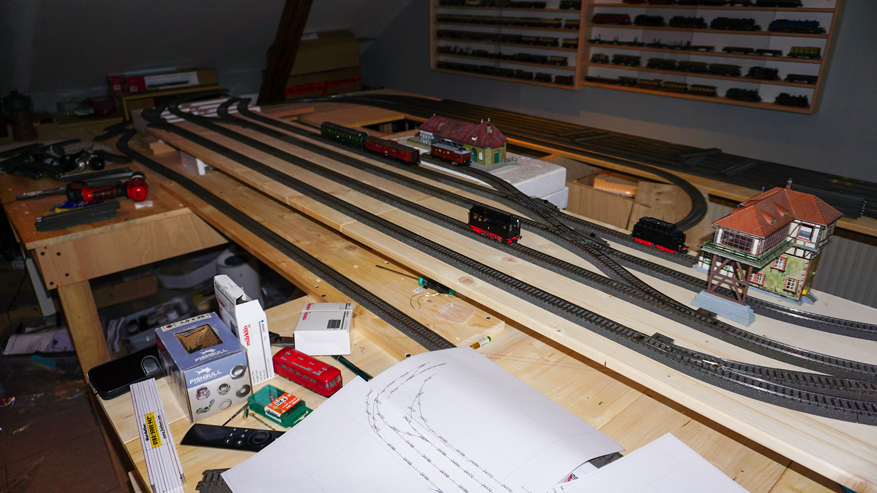 Endlich.... Der HBf, die Schattenbahnhöfe 1 und 2. Zusammen mit den entsprechenden Zufahrten sind fertig. Und alles auf 3mm Moosgummi gedämmt.
