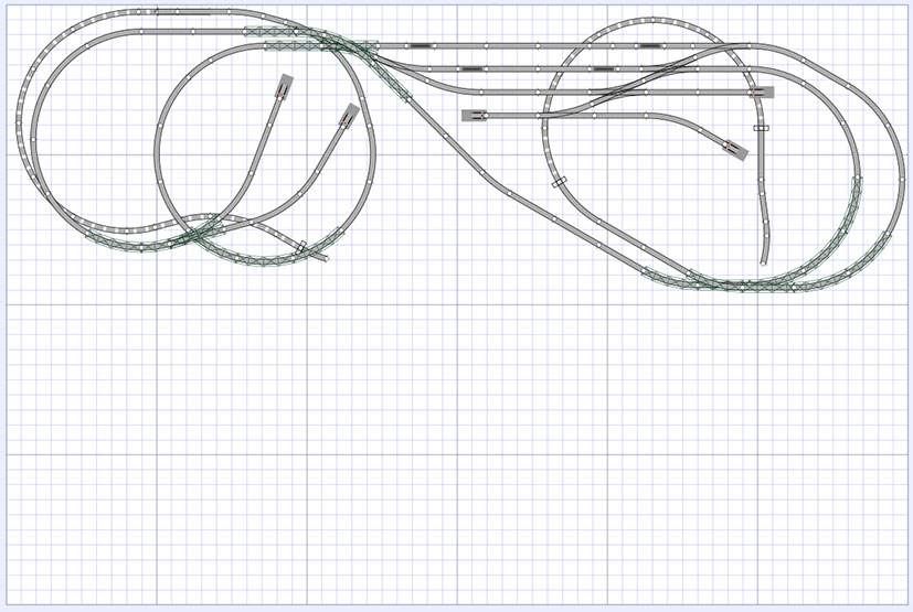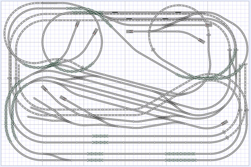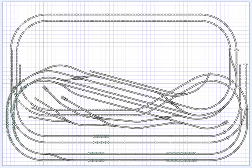 Ein weiterer Gleisplan zum Anlagenthema. Auch hier können bis zu 4-5 Züge gleichzeitig unterwegs sein. Ohne den Rangierbetrieb ganz zu vernachlässigen. 99 Meter wollen dabei befahren werden.