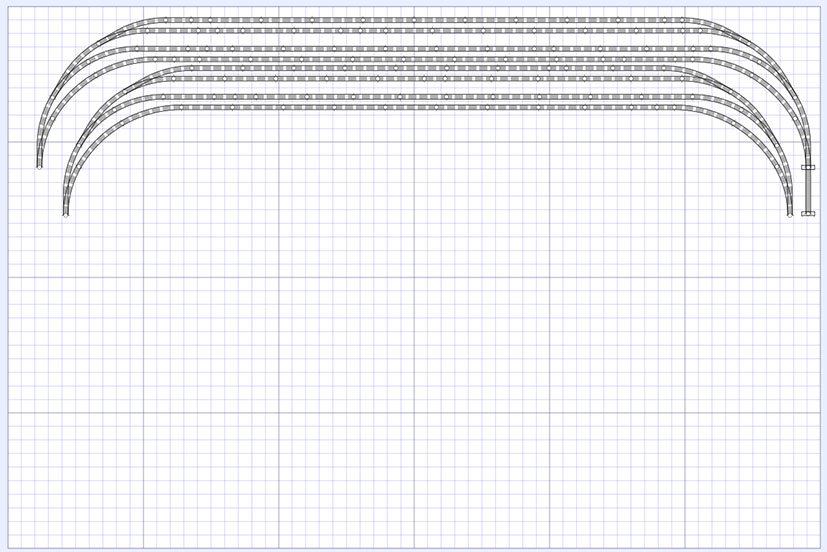 Dieser Schattenbahnhof liegt dann etwas komprimiert um Platz unterhalb der Anlage zu haben. Somit sind bei 2 m Tiefe die verdeckten Abschnitte gut erreichbar. Da wenig Tiefe verbraucht wird könnten jeweils noch  beide Bereiche um 1 oder 2 Gleise erweitert werden